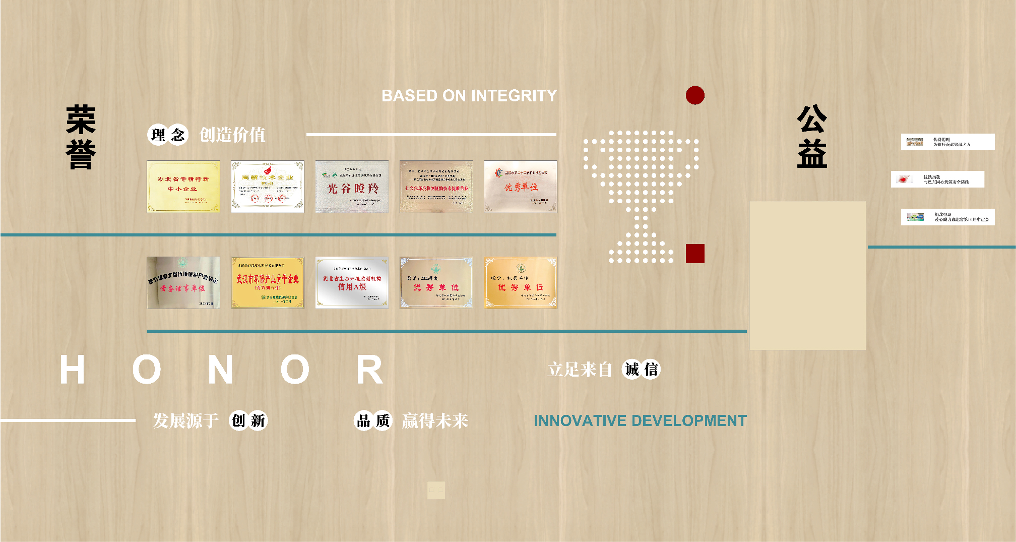項目背景:華正環(huán)境是一家專業(yè)從事環(huán)境檢測并基于環(huán)境檢測開展環(huán)境咨詢服務的高新技術企業(yè), 成立于2013年,總部位于武漢市東湖高新技術開發(fā)區(qū)。旗下設有武漢華正、江西慧正、寧夏華正、宜昌華正、襄陽華正等5個標準化實驗室以及華正環(huán)境研究院、湖北葦杭環(huán)??萍加邢薰镜葘I(yè)的環(huán)境咨詢服務機構。 經過近10年的發(fā)展,“華正環(huán)境”依托自有具有規(guī)?;牡谌江h(huán)境檢測平臺,構建特色鮮明、優(yōu)勢互補的環(huán)境檢測和環(huán)境咨詢“雙輪驅動(T+C)”發(fā)展模式。全方位為政府、園區(qū)、企業(yè)提供 “一站式”第三方環(huán)境綜合服務,統(tǒng)籌解決各方面環(huán)境問題。服務范圍覆蓋華中及中西部地區(qū)多個省份,為近萬家客戶提供各類“環(huán)境檢測”和“環(huán)境咨詢” 綜合解決方案。艾的爾品牌設計承接其文化墻設計,與客戶深入溝通后,結合企業(yè)自身特點,從企業(yè)簡介,發(fā)展歷程,使命,愿景,榮譽,公益等出發(fā),內容簡潔明了、主題突出。
